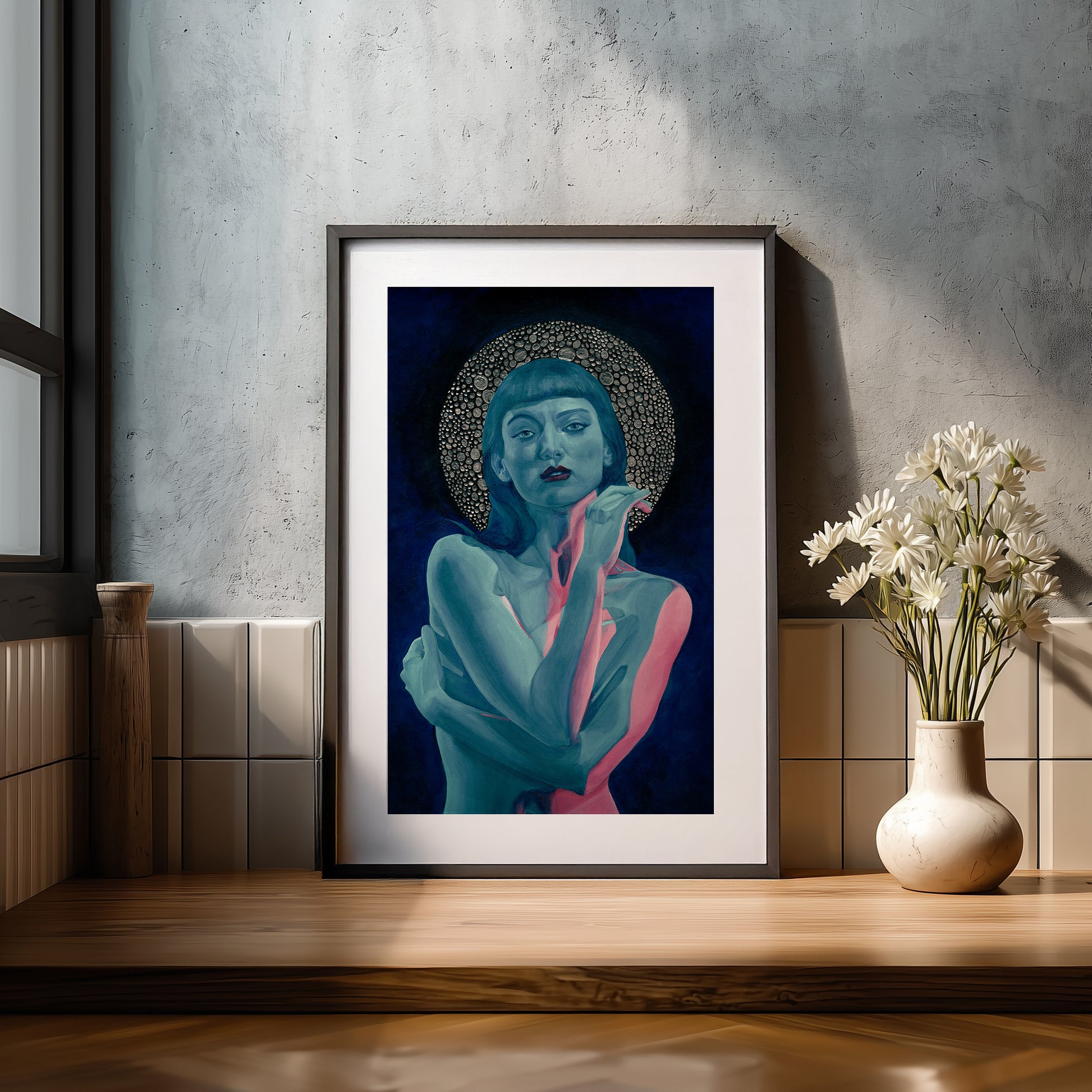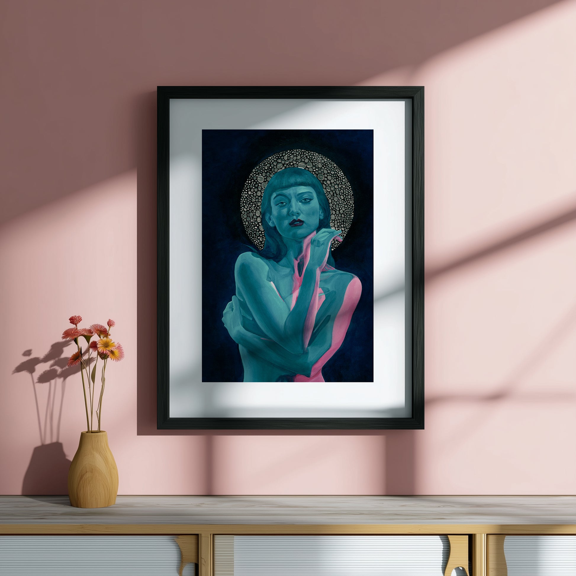 This bold Portrait art print features a striking figure rendered in rich teal and pink tones, bringing colour, confidence, and modern energy into a space. With its expressive palette and contemporary composition, it adds personality and visual impact without feeling overpowering. It works beautifully in bedrooms, living spaces, or as part of a gallery wall. Printed on archival-quality paper to preserve colour and detail, this piece strikes a balance between bold expression and calm presence — perfect for those who enjoy colour-forward art with a relaxed attitude.